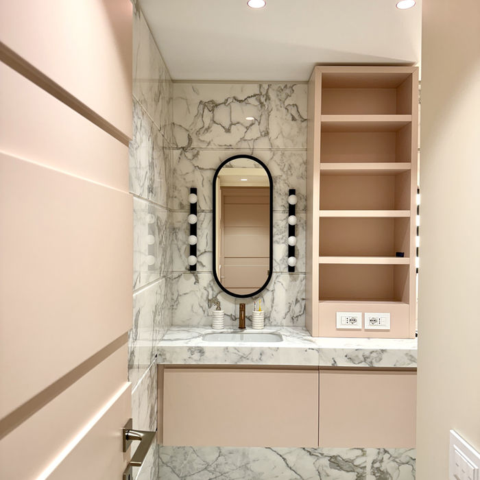 - Bathrooms: with suspended bases, horizontal grooves and drawers, custom-made mirrors and open element with recessed sockets, all matt lacquered. Marble top to complete